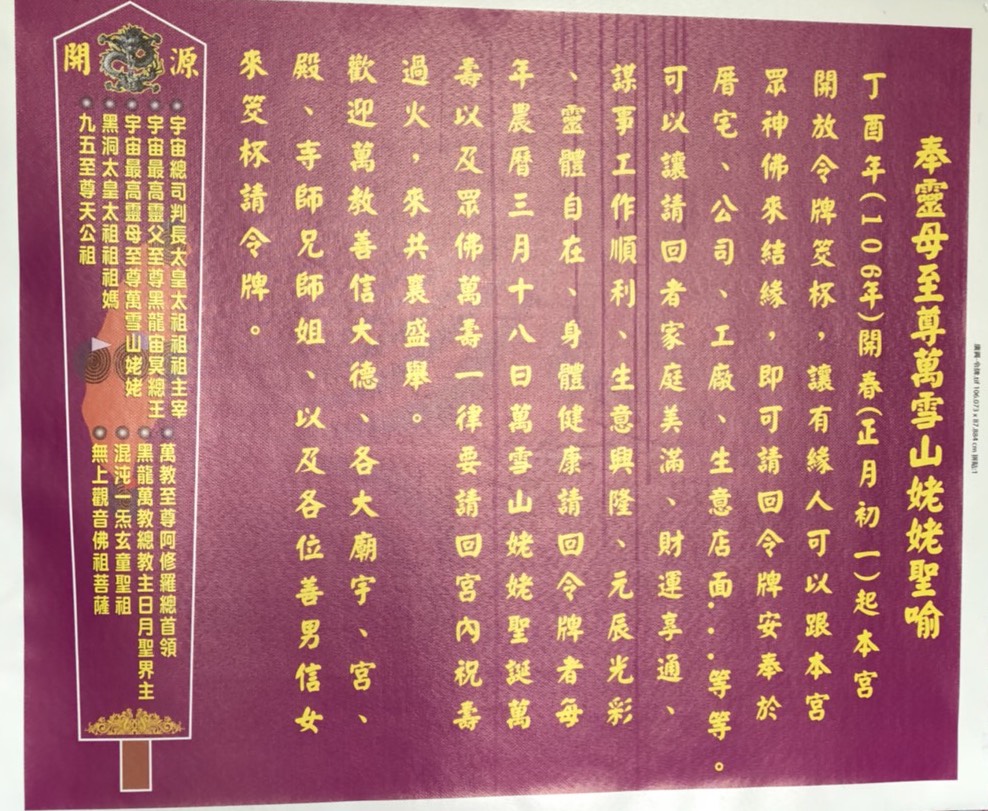 本宮緣於民國七十五年開始由皇陽宮創辦人翁坤城接旨替猿母姥姥來辦聖事,一直到民國一O三年無形第三科期正式圓盤交旨,正式接掌第四科期黑龍王科期來行使聖賢大道普化。